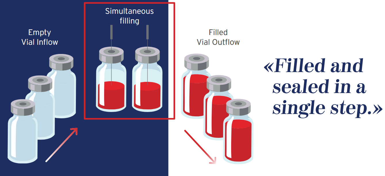 BTS SAF sterile automatic filling technology utilizes closed vials with self-sealing septa. Paired with a specially designed needle, this system enables direct filling while maintaining sterility throughout the entire process.